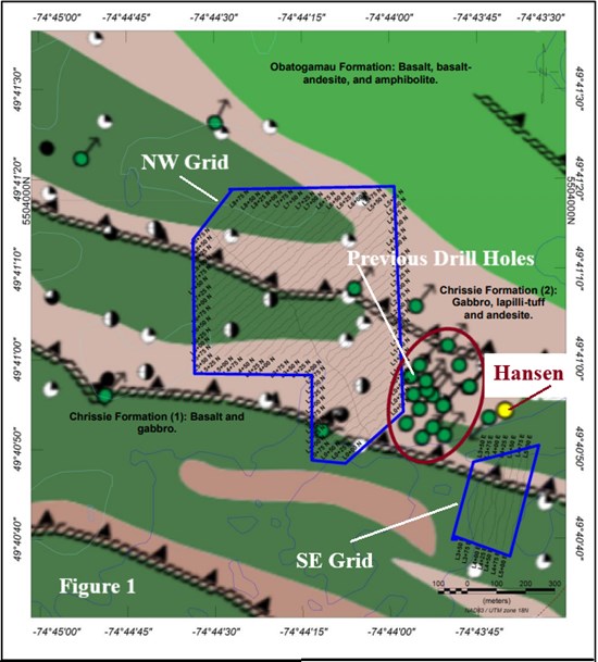 Figure 1: Simplified geological map of the Hansen property showing the 2021 grid location, the Hansen prospect, and the historical drillholes.