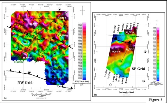 The previous Mag and VLF/EM data over the main target area of Hansen prospect was collected over the NW and the SE grids. The lines were spaced 25 meters apart (Figure 1). There are several discrete magnetic anomalies scattered within the surveyed grids (Figure 2). The amplitudes of the detected anomalies range from 20 to 320 nT above the local magnetic background. Interpretation of the VLF-EM data in the NW grid allowed the identification of four (4) moderate to highly conductive electromagnetic axis with lengths of 140 to 375 meters (Figure 3).