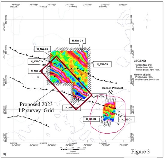 The geophysical crew will mobilize to the property this summer to conduct the I.P survey over the NW grid which is the main target area of the Hansen prospect. An area within the grid that was previously drilled returned 12.8 g/t Au over 1.05 meters, 7.94 g/t Au over 1.05 meters and 75.29 g/t Au across 0.3 meters. The survey will help in locating the best drill hole locations for the next phase of drilling. The I.P survey is designed to cover an area of 500 meters long by 250 meters wide to define priority Hansen gold exploration targets.