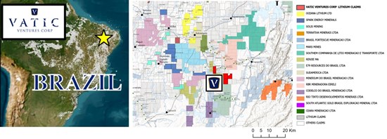 The Solonópole South Lithium Property consists of 4 claim blocks covering 4,813.57 hectares. The property is located in the coastal state of Ceara in Northeast Brazil, 40 km from the city of Solonópole in a known pegmatite mining district. Vatic’s Solonópole South Property is also located approximately 30 km Southeast of Oceana Lithium Limited’s (“OCN” – ASX) property. Oceana Lithium Limited’s recent sampling returned up to 9.89% Li2O as well as over 1% Ta, 1% Nb, over 1000 ppm Tin, and over 2.5% Be.